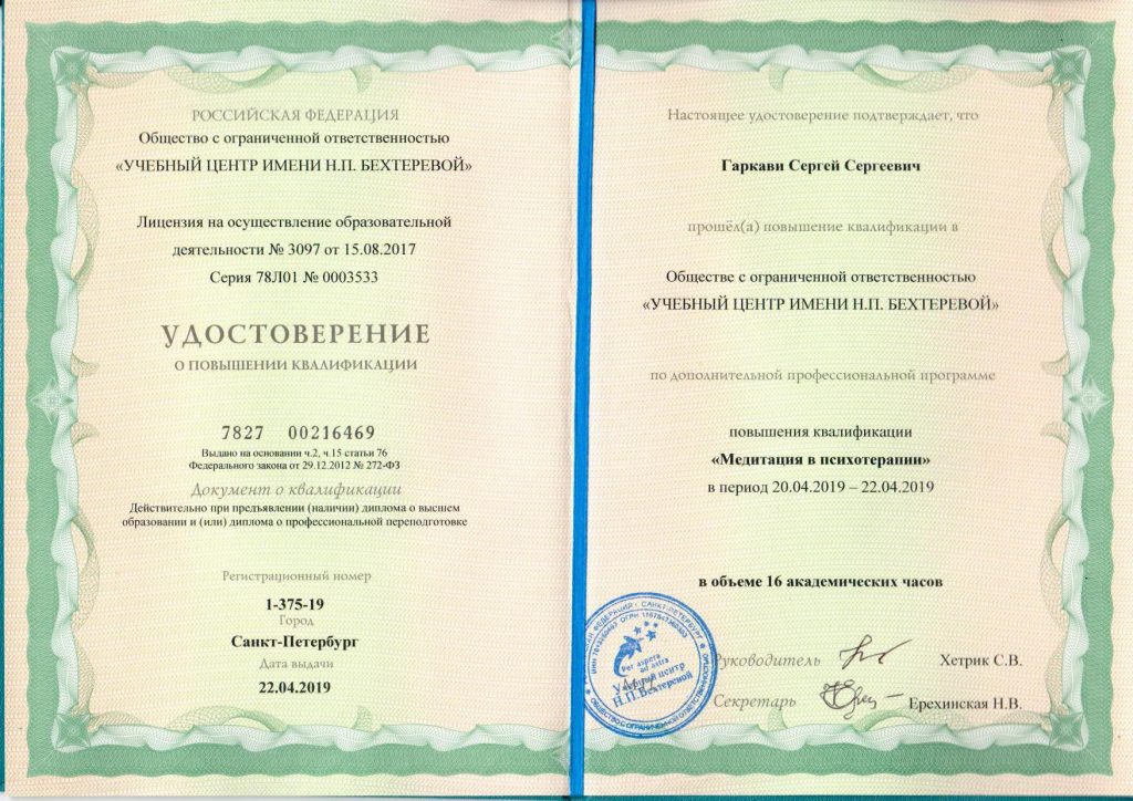 · Повышение квалификации по программе «Медитация в психотерапии» (16 ак.ч.) «Учебный центр имени Н.П. Бехтеревой» (2019г.)