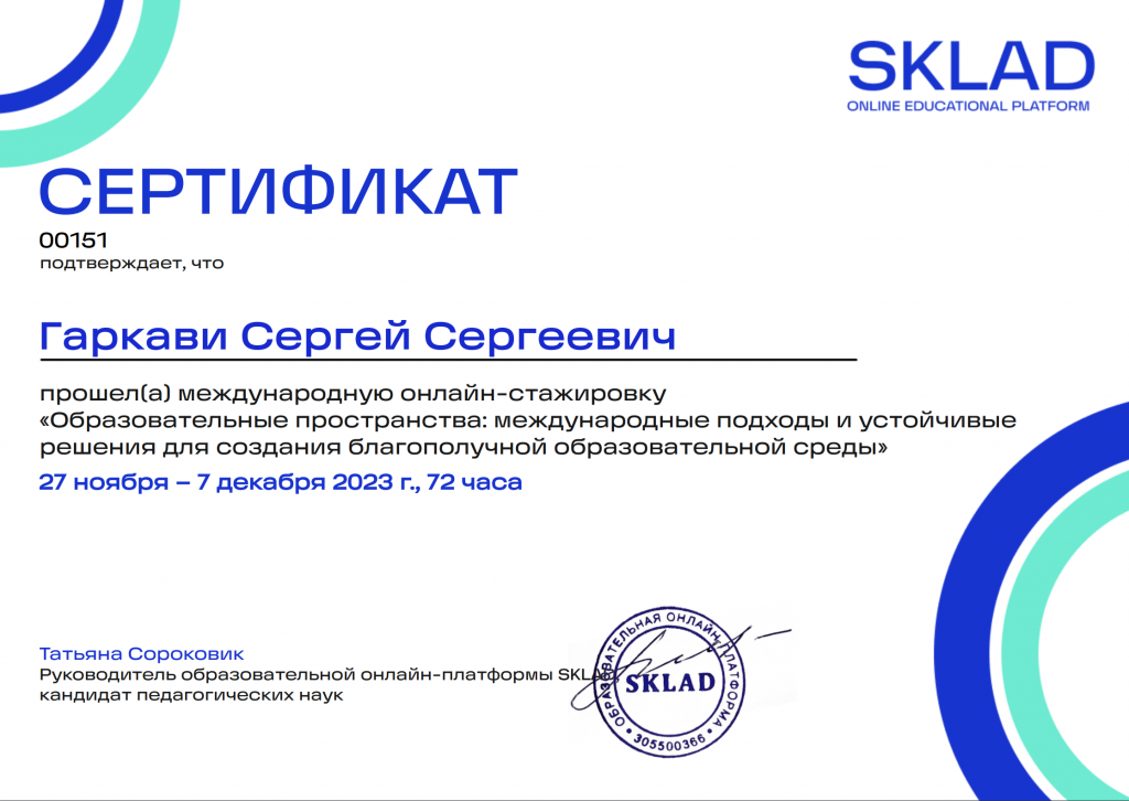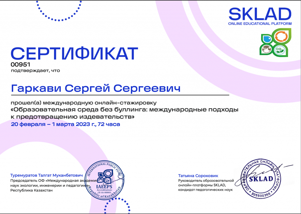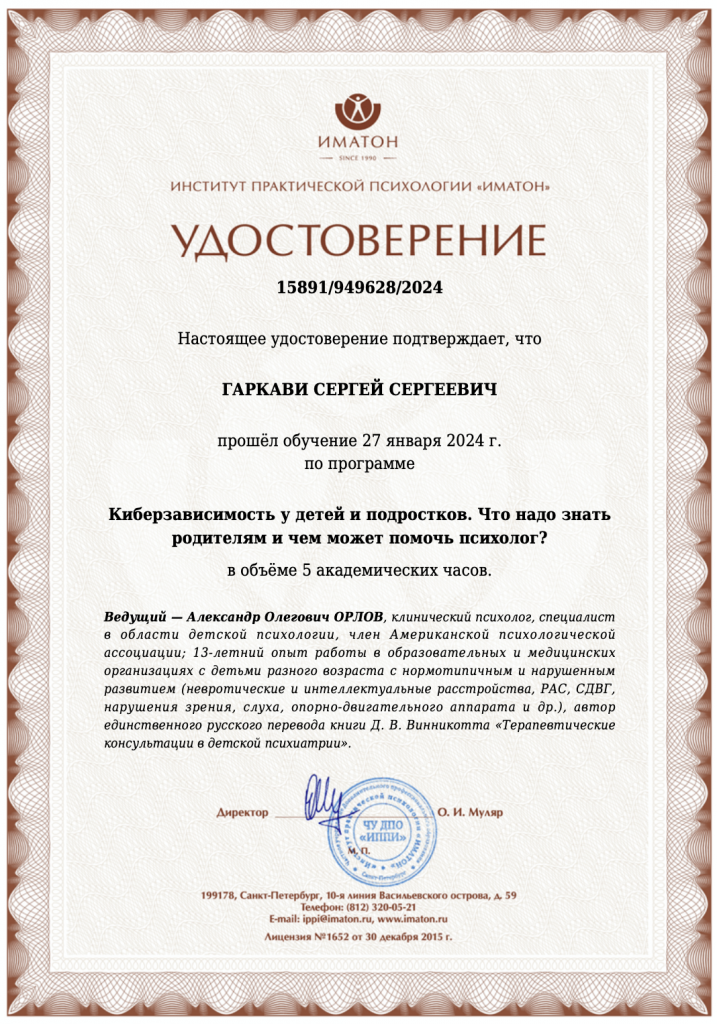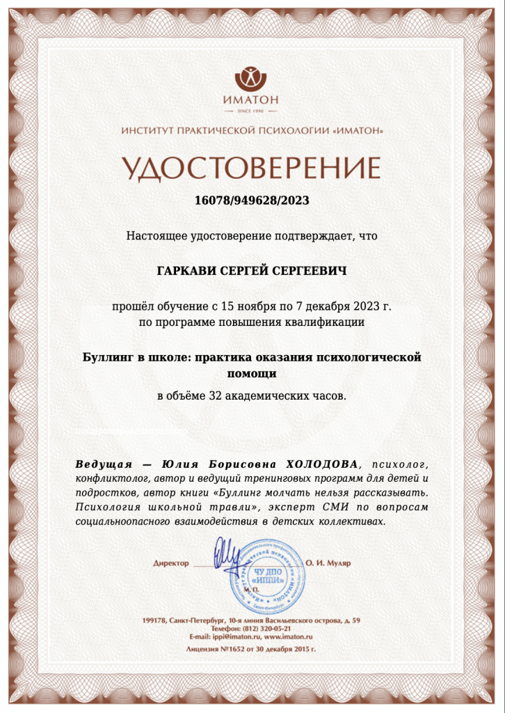 · Повышение квалификации по программе «Буллинг в школе: практика оказания психологической помощи» (32 ак.ч.) «Институт практической психологии Иматон» (2023г.)